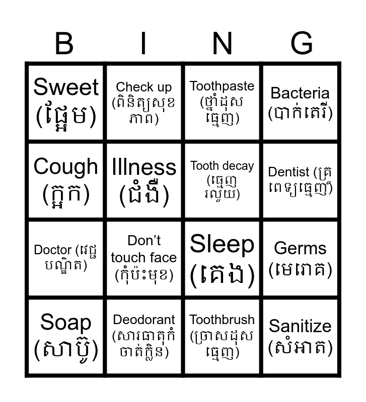 This bingo card has 29 words: Brush Teeth (ដុសធ្មេញ), Milk (ទឹកដោះគោ), Germs (មេរោគ), Water (ទឹក), Sweet (ផ្អែម), Toothpaste (ថ្នាំដុសធ្មេញ), Tooth decay (ធ្មេញរលួយ), Wash Face (លាងមុខ), Deodorant (សារធាតុកំចាត់ក្លិន), Fried (អាំង), Toothbrush (ច្រាសដុសធ្មេញ), Soap (សាប៊ូ), Floss (ខ្សែសំអាតធ្មេញ), Wash hands (លាងដៃ), Don’t touch face (កុំប៉ះមុខ), Shower (ងូតទឹក), Trim nails (កាត់ក្រចក), Sanitize (សំអាត), Cough (ក្អក), Sleep (គេង), Mask (ម៉ាស់), Exercise (លំហាត់ប្រាណ), Doctor (វេជ្ជបណ្ឌិត), Illness (ជំងឺ), Bacteria (បាក់តេរី), Check up (ពិនិត្យសុខភាព), Healthy (មានសុខភាពល្អ), Dentist (គ្រូពេទ្យធ្មេញ) and Vegetables (បន្លែ).