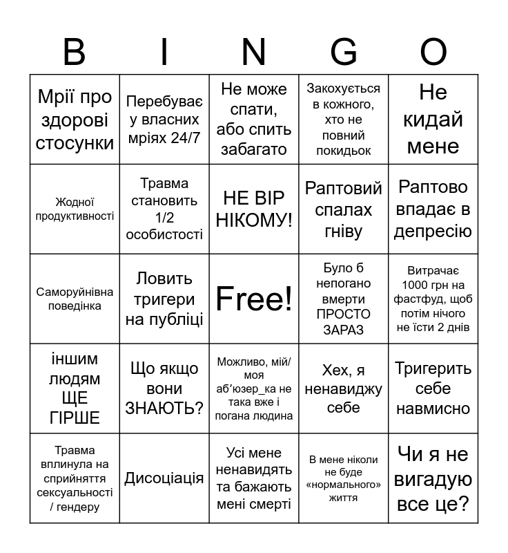 This bingo card has a free space and 24 words: Що якщо вони ЗНАЮТЬ?, Дисоціація, НЕ ВІР НІКОМУ!, Травма вплинула на сприйняття сексуальності / гендеру, Не кидай мене, Мрії про здорові стосунки, Жодної продуктивності, Перебуває у власних мріях 24/7, Було б непогано вмерти ПРОСТО ЗАРАЗ, Можливо, мій/моя абʼюзер_ка не така вже і погана людина, Раптовий спалах гніву, Саморуйнівна поведінка, Хех, я ненавиджу себе, Тригерить себе навмисно, Травма становить 1/2 особистості, В мене ніколи не буде «нормального» життя, Витрачає 1000 грн на фастфуд, щоб потім нічого не їсти 2 днів, Не може спати, або спить забагато, Раптово впадає в депресію, Ловить тригери на публіці, Чи я не вигадую все це?, іншим людям ЩЕ ГІРШЕ, Закохується в кожного, хто не повний покидьок and Усі мене ненавидять та бажають мені смерті.