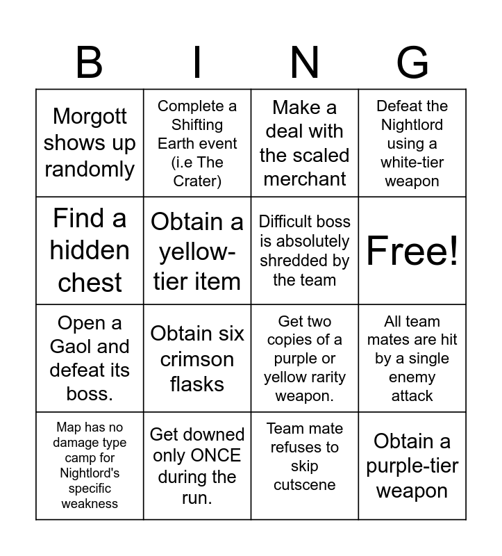 This bingo card has 17 words: Team mate refuses to skip cutscene, Map has no damage type camp for Nightlord's specific weakness, Make a deal with the scaled merchant, Morgott shows up randomly, Obtain six crimson flasks, Defeat the Nightlord using a white-tier weapon, All team mates are hit by a single enemy attack, Difficult boss is absolutely shredded by the team, Free!, Obtain a yellow-tier item, Get downed only ONCE during the run., Get two copies of a purple or yellow rarity weapon., Find a hidden chest, Complete a Shifting Earth event (i.e The Crater), Open a Gaol and defeat its boss., Find the remains of a previous nightfarer and Obtain a purple-tier weapon.
