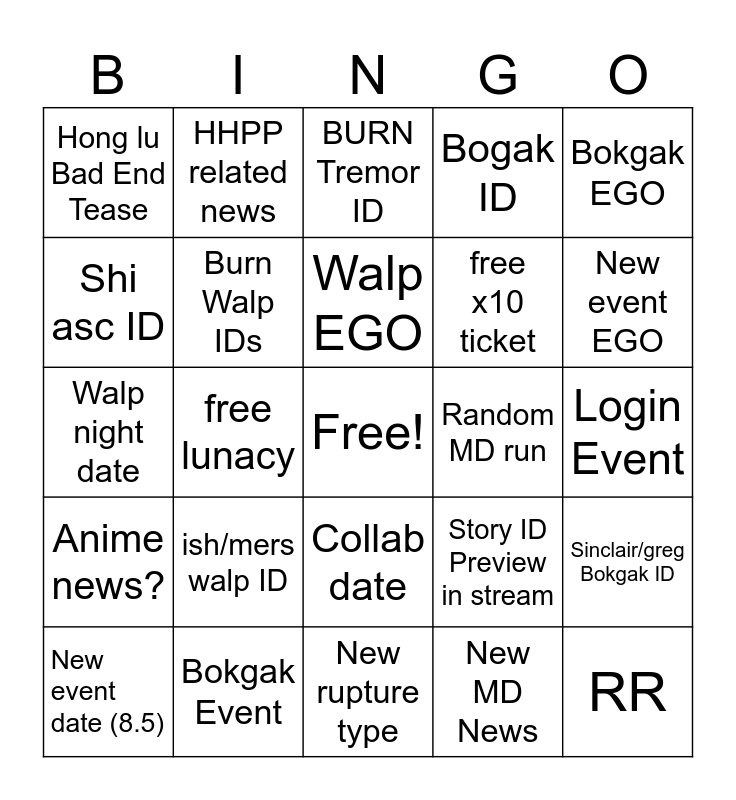 This bingo card has a free space and 24 words: New event date (8.5), ish/mers walp ID, Walp EGO, New MD News, Bokgak EGO, Hong lu Bad End Tease, HHPP related news, BURN Tremor ID, Random MD run, Login Event, Walp night date, Burn Walp IDs, Story ID Preview in stream, Sinclair/greg Bokgak ID, Shi asc ID, Bokgak Event, New rupture type, Bogak ID, New event EGO, Anime news?, free lunacy, Collab date, free x10 ticket and RR.