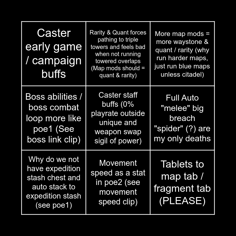 This bingo card has a free space and 8 words: Full Auto "melee" big breach "spider" (?) are my only deaths, More map mods = more waystone & quant / rarity (why run harder maps, just run blue maps unless citadel), Rarity & Quant forces pathing to triple towers and feels bad when not running towered overlaps (Map mods should = quant & rarity), Why do we not have expedition stash chest and auto stack to expedition stash (see poe1), Caster early game / campaign buffs, Tablets to map tab / fragment tab (PLEASE), Boss abilities / boss combat loop more like poe1 (See boss link clip) and Movement speed as a stat in poe2 (see movement speed clip).