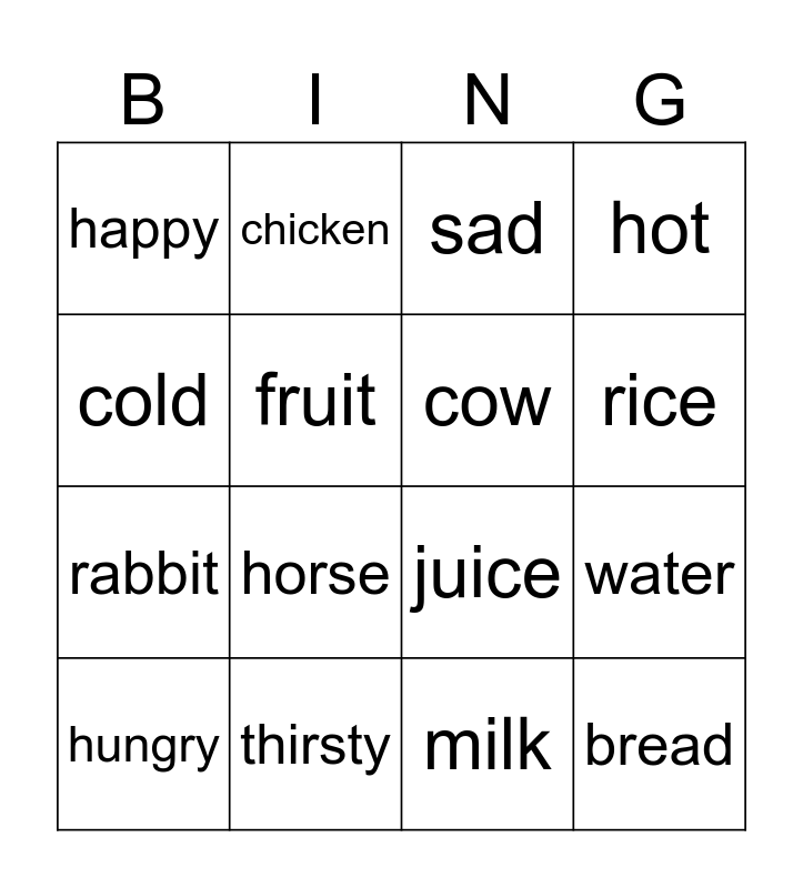 This bingo card has 16 words: hungry, thirsty, sad, hot, cold, chicken, juice, water, happy, fruit, milk, rice, rabbit, horse, cow and bread.