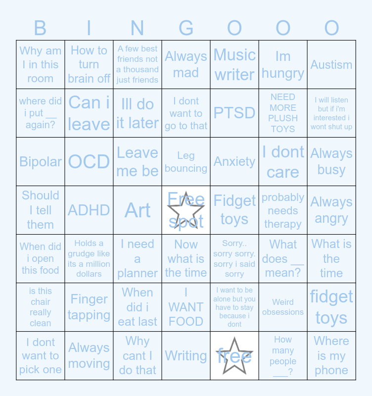 This bingo card has 1 images, a free space and 48 words: I want to be alone but you have to stay because i dont, NEED MORE PLUSH TOYS, Writing, ADHD, Leave me be, Always angry, How to turn brain off, Always moving, Im hungry, Now what is the time, Austism, Always mad, I dont care, Anxiety, is this chair really clean, probably needs therapy, where did i put __ again?, I will listen but if i'm interested i wont shut up, Weird obsessions, Music writer, PTSD, Art, Why am I in this room, Can i leave, fidget toys, Ill do it later, Always busy, I dont want to pick one, Leg bouncing, OCD, How many people ___?, Fidget toys, What is the time, Finger tapping, Should I tell them, Sorry.. sorry sorry. sorry i said sorry, What does __ mean?, Bipolar, I need a planner, When did i eat last, When did i open this food, Where is my phone, A few best friends not a thousand just friends, Why cant I do that, I dont want to go to that, I WANT FOOD, Holds a grudge like its a million dollars and free.