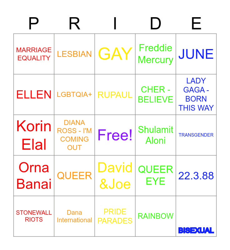 This bingo card has a free space and 24 words: STONEWALL RIOTS, QUEER, RUPAUL, RAINBOW, JUNE, MARRIAGE EQUALITY, LESBIAN, GAY, Shulamit Aloni, TRANSGENDER, Korin Elal, LGBTQIA+, QUEER EYE, 22.3.88, ELLEN, Dana International, PRIDE PARADES, Freddie Mercury, LADY GAGA - BORN THIS WAY, Orna Banai, DIANA ROSS - I'M COMING OUT, David &Joe, CHER - BELIEVE and BISEXUAL.
