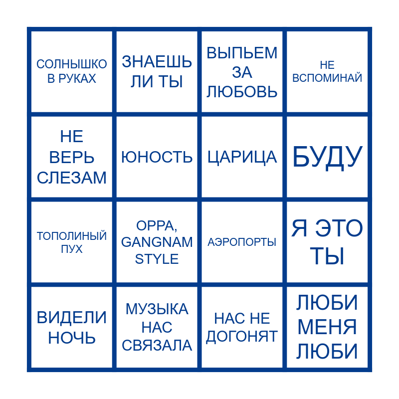 This bingo card has 50 words: БАТАРЕЙКА, ВИДЕЛИ НОЧЬ, ПЛОХАЯ ДЕВОЧКА, MACARENA, ФАНТАЗЕР, МАМА ЛЮБА, ЗНАЕШЬ ЛИ ТЫ, ПОЕЗДА, ЮНОСТЬ, ФЕДЕРИКО ФЕЛЛИНИ, ЦАРИЦА, НЕ ВСПОМИНАЙ, КОМЕТА, ЗИМА В СЕРДЦЕ, 7 ЛЕПЕСТОК, ТАКИЕ ДЕВУШКИ КАК ЗВЕЗДЫ, БУДУ, МУЗЫКА НАС СВЯЗАЛА, КУКЛА КОЛДУНА, НЕ ВЕРЬ СЛЕЗАМ, Я ЭТО ТЫ, О НЕМ, СОЛНЫШКО В РУКАХ, ТОПОЛИНЫЙ ПУХ, АЛЕШКА, ТЫ УЗНАЕШЬ ЕЁ, OPPA, GANGNAM STYLE, DESPACITO, ВЫПЬЕМ ЗА ЛЮБОВЬ, ВОЗЛЕ ДОМА ТВОЕГО, МАРМЕЛАДНЫЙ, ДРУГАЯ ПРИЧИНА, ДЕНЬ И НОЧЬ, ПОЖАРЫ, IT'S MY LIFE, КРАШ, СОЛНЦЕ МОНАКО, РОЗОВОЕ ВИНО, КОЛАМБИЯ ПИКЧЕРЗ, НАС НЕ ДОГОНЯТ, МАЛЫШКА, THE FINAL COUNTDOWN, СИДИМ С БОБРОМ ЗА СТОЛОМ, СИГМА БОЙ, МЛАДШИЙ ЛЕЙТЕНАНТ, АЭРОПОРТЫ, КРОШКА МОЯ, ЕСЛИ ХОЧЕШЬ ОСТАТЬСЯ, ЛЮБИ МЕНЯ ЛЮБИ and АМЕРИКАН БОЙ.