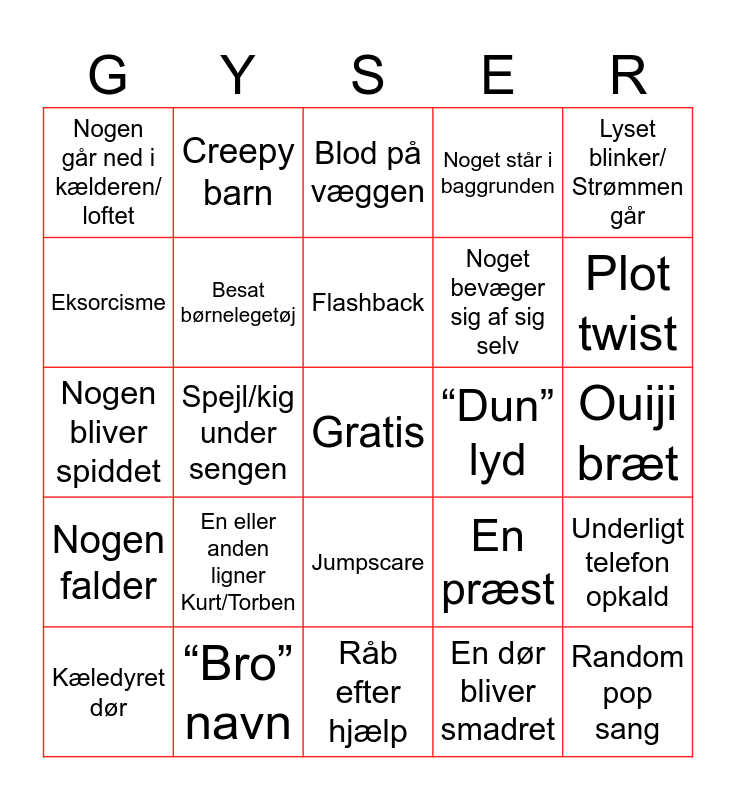 This bingo card has a free space and 24 words: Kæledyret dør, En eller anden ligner Kurt/Torben, Flashback, En dør bliver smadret, Lyset blinker/ Strømmen går, Nogen går ned i kælderen/ loftet, Creepy barn, Blod på væggen, “Dun” lyd, Ouiji bræt, Nogen bliver spiddet, Besat børnelegetøj, En præst, Underligt telefon opkald, Eksorcisme, “Bro” navn, Råb efter hjælp, Noget står i baggrunden, Plot twist, Nogen falder, Spejl/kig under sengen, Jumpscare, Noget bevæger sig af sig selv and Random pop sang.