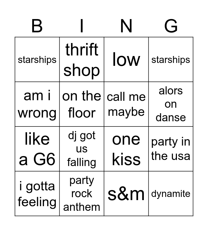 This bingo card has 20 words: party in the usa, payphone, low, club cant handle me, i gotta feeling, am i wrong, party rock anthem, starships, like a G6, thrift shop, dj got us falling, one kiss, on the floor, dynamite, call me maybe, pursuit of happiness, alors on danse, starships, s&m and price tag.