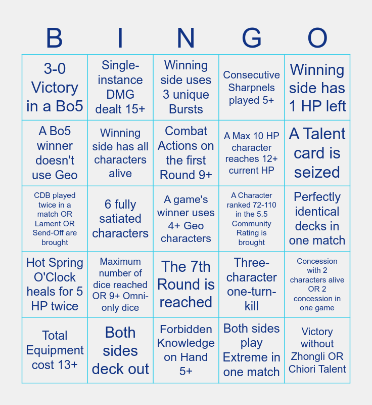 This bingo card has a free space and 24 words: Total Equipment cost 13+, Maximum number of dice reached OR 9+ Omni-only dice, Combat Actions on the first Round 9+, Both sides play Extreme in one match, Winning side has 1 HP left, 3-0 Victory in a Bo5, Single-instance DMG dealt 15+, Winning side uses 3 unique Bursts, A Character ranked 72-110 in the 5.5 Community Rating is brought, Perfectly identical decks in one match, CDB played twice in a match OR Lament OR Send-Off are brought, Winning side has all characters alive, Three-character one-turn-kill, Concession with 2 characters alive OR 2 concession in one game, A Bo5 winner doesn't use Geo, Both sides deck out, Forbidden Knowledge on Hand 5+, Consecutive Sharpnels played 5+, A Talent card is seized, Hot Spring O'Clock heals for 5 HP twice, 6 fully satiated characters, The 7th Round is reached, A Max 10 HP character reaches 12+ current HP and Victory without Zhongli OR Chiori Talent.