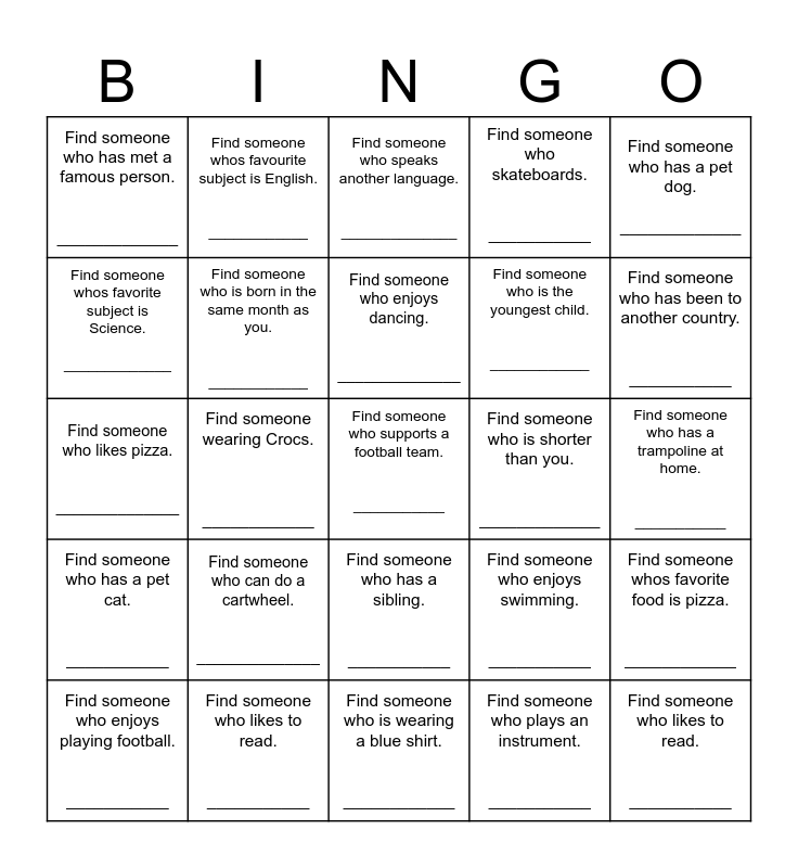 This bingo card has a free space and 34 words: Find someone whos favourite subject is PE. ______________, Find someone who plays an instrument. ___________, Find someone who is left handed. ___________, Find someone whos name starts with the same letter as yours. ______________, Find someone who has a pet cat. ___________, Find someone who is born in the same month as you. ____________, Find someone who has a pet dog. _____________, Find someone who enjoys playing football. ___________, Find someone whos favourite subject is English. ____________, Find someone who enjoys cooking or baking. ___________, Find someone who enjoys dancing. ______________, Find someone who speaks another language. ______________, Find someone whos favourite subject is art. __________, Find someone who was born in the same month as you. ______________, Find someone who is shorter than you. _____________, Find someone who has been to another country. ___________, Find someone who likes to read. ___________, Find someone who likes pizza. ______________, Find someone who can do a cartwheel. ______________, Find someone who enjoys swimming. ___________, Find someone who has a sibling. ___________, Find someone who has been to a concert. ___________, Find someone who has met a famous person. _____________, Find someone who has a trampoline at home. ___________, Find someone who is wearing a blue shirt. ____________, Find someone who likes to read. ___________, Find someone who skateboards. ___________, Find someone who is the middle child. _____________, Find someone who is the youngest child. ____________, Find someone whos favorite subject is Science. _____________, Find someone who has no pets. _____________, Find someone wearing Crocs. ____________, Find someone whos favorite food is pizza. ____________ and Find someone who is wearing nail polish. ____________.
