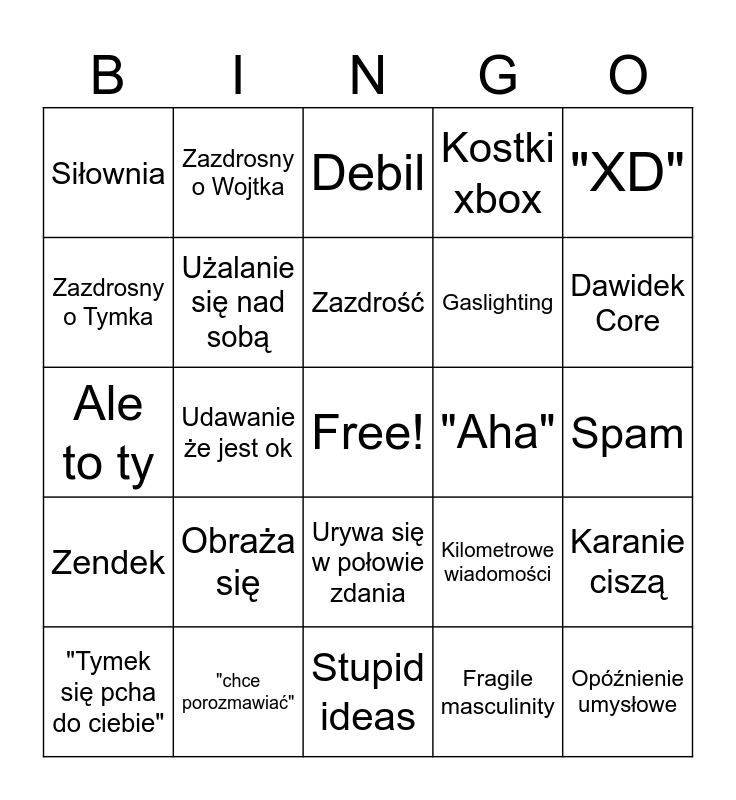 This bingo card has a free space and 24 words: Obraża się, "chce porozmawiać", Zazdrość, "Tymek się pcha do ciebie", "XD", Siłownia, Zazdrosny o Tymka, Zazdrosny o Wojtka, "Aha", Urywa się w połowie zdania, Gaslighting, Ale to ty, Kilometrowe wiadomości, Karanie ciszą, Użalanie się nad sobą, Fragile masculinity, Spam, Debil, Dawidek Core, Udawanie że jest ok, Opóźnienie umysłowe, Zendek, Kostki xbox and Stupid ideas.