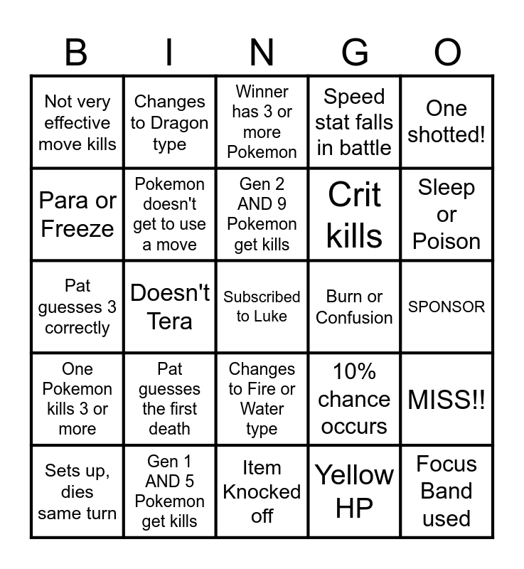 This bingo card has a free space and 24 words: Pat guesses the first death, Gen 1 AND 5 Pokemon get kills, Gen 2 AND 9 Pokemon get kills, Sets up, dies same turn, One shotted!, Not very effective move kills, Para or Freeze, Changes to Dragon type, Burn or Confusion, Changes to Fire or Water type, Crit kills, Pat guesses 3 correctly, 10% chance occurs, MISS!!, Pokemon doesn't get to use a move, Yellow HP, SPONSOR, Winner has 3 or more Pokemon, Sleep or Poison, Doesn't Tera, Focus Band used, One Pokemon kills 3 or more, Speed stat falls in battle and Item Knocked off.