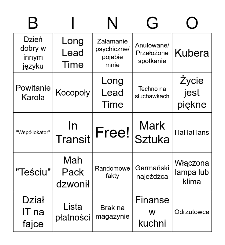 This bingo card has a free space and 61 words: Idziemy przegrać?, Lista płatności, Payment issue, "Teściu", Finanse w kuchni, Suplementy, Kocopoły, Aga na rowerze, Techno na słuchawkach, Randomowe fakty, Anulowane/ Przełożone spotkanie, Pawłowski w biurze, Powitanie Karola, Aga z HR, Życie jest piękne, Dzień dobry w innym języku, Odrzutowce, Kubera, Życie jest piękne, Long Lead Time, Mark Sztuka, Załamanie psychiczne/ pojebie mnie, Dział IT na fajce, Włączona lampa lub klima, Aga z HR, Odwiedziny Mikiego M/G, Aga w Punto, Aga na Rowerze, Życie jest piękne, Payment Issue, Prepayment, Lista płatności, "Pawlak", "Walenty", Long Lead Time, Powitanie Karola, Powitanie Jakuba, In Transit, Techno na słuchawkach, "Współlokator", CS issue, Mah Pack dzwonił, HaHaHans, Mark Sztuka, Germański najeźdźca, Odrzutowce, Sprawdzanie lotów, Pojebie mnie, Przeklinająca Swieta, Randomowe fakty, Brak na magazynie, Dziwne akcje na operacyjnym, Dziwne akcje na open space, Kocopoły, Bambiki, Idziemy przegrać?, Dzień dobry w innym języku, Anulowane/Przełożone spotkanie, "Teściu", Suplementy and Włączona lampka lub klima.