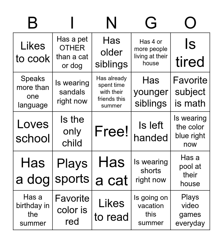 This bingo card has a free space and 24 words: Plays sports, Favorite color is red, Has already spent time with their friends this summer, Has a birthday in the summer, Is tired, Likes to cook, Speaks more than one language, Has a pet OTHER than a cat or dog, Is left handed, Has a cat, Has younger siblings, Loves school, Is wearing shorts right now, Has a pool at their house, Is wearing sandals right now, Is going on vacation this summer, Is wearing the color blue right now, Has older siblings, Favorite subject is math, Is the only child, Plays video games everyday, Has a dog, Has 4 or more people living at their house and Likes to read.