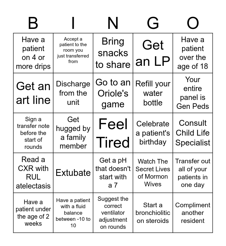This bingo card has a free space and 24 words: Extubate, Have a patient with a fluid balance between -10 to 10, Go to an Oriole's game, Have a patient under the age of 2 weeks, Have a patient over the age of 18, Have a patient on 4 or more drips, Get an art line, Accept a patient to the room you just transferred from, Celebrate a patient's birthday, Get a pH that doesn't start with a 7, Refill your water bottle, Sign a transfer note before the start of rounds, Watch The Secret Lives of Mormon Wives, Transfer out all of your patients in one day, Discharge from the unit, Start a bronchiolitic on steroids, Consult Child Life Specialist, Bring snacks to share, Your entire panel is Gen Peds, Get hugged by a family member, Compliment another resident, Read a CXR with RUL atelectasis, Get an LP and Suggest the correct ventilator adjustment on rounds.