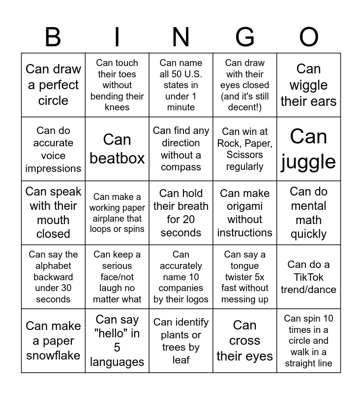 This bingo card has 25 words: Can say the alphabet backward under 30 seconds, Can say "hello" in 5 languages, Can hold their breath for 20 seconds, Can cross their eyes, Can wiggle their ears, Can draw a perfect circle, Can touch their toes without bending their knees, Can name all 50 U.S. states in under 1 minute, Can make origami without instructions, Can do a TikTok trend/dance, Can do accurate voice impressions, Can beatbox, Can identify plants or trees by leaf, Can say a tongue twister 5x fast without messing up, Can juggle, Can make a paper snowflake, Can make a working paper airplane that loops or spins, Can find any direction without a compass, Can win at Rock, Paper, Scissors regularly, Can do mental math quickly, Can speak with their mouth closed, Can keep a serious face/not laugh no matter what, Can accurately name 10 companies by their logos, Can draw with their eyes closed (and it's still decent!) and Can spin 10 times in a circle and walk in a straight line.