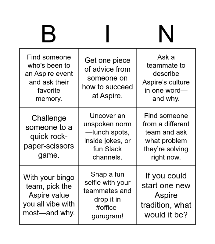 This bingo card has a free space and 8 words: Find someone from a different team and ask what problem they’re solving right now., Ask a teammate to describe Aspire’s culture in one word—and why., Get one piece of advice from someone on how to succeed at Aspire., With your bingo team, pick the Aspire value you all vibe with most—and why., Find someone who's been to an Aspire event and ask their favorite memory., If you could start one new Aspire tradition, what would it be?, Challenge someone to a quick rock-paper-scissors game. and Snap a fun selfie with your teammates and drop it in #office-gurugram!.