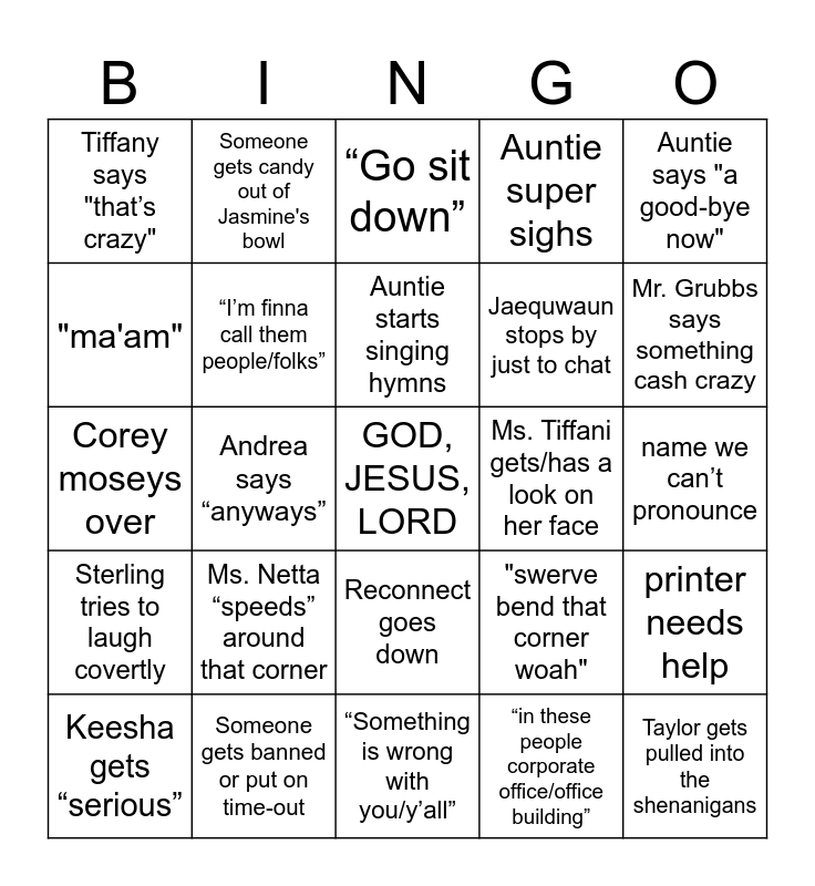 This bingo card has a free space and 24 words: Ms. Netta “speeds” around that corner, Someone gets banned or put on time-out, Auntie starts singing hymns, Keesha gets “serious”, Auntie says "a good-bye now", Tiffany says "that’s crazy", "ma'am", Someone gets candy out of Jasmine's bowl, Ms. Tiffani gets/has a look on her face, Reconnect goes down, Jaequwaun stops by just to chat, Corey moseys over, "swerve bend that corner woah", printer needs help, “I’m finna call them people/folks”, “in these people corporate office/office building”, name we can’t pronounce, “Go sit down”, Mr. Grubbs says something cash crazy, Andrea says “anyways”, Taylor gets pulled into the shenanigans, Sterling tries to laugh covertly, Auntie super sighs and “Something is wrong with you/y’all”.