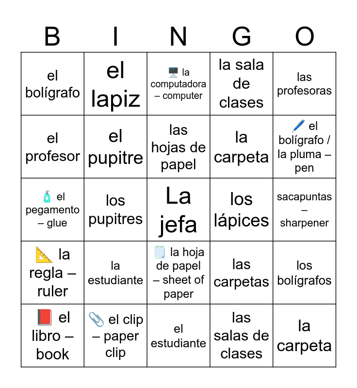 This bingo card has a free space and 49 words: el bolígrafo, la carpeta, el cuaderno, el estudiante, la estudiante, la hoja de papel, el lapiz, el libro, el profesor, la profesora, el pupitre, la sala de clases, los bolígrafos, las carpetas, los cuadernos, las estudiantes, las hojas de papel, los lápices, los libros, las profesoras, los pupitres, las salas de clases, el bolígrafo, la carpeta, ✏️ el lápiz – pencil, 🖊️ el bolígrafo / la pluma – pen, 📕 el libro – book, 📓 el cuaderno – notebook, 🗒️ la hoja de papel – sheet of paper, 📐 la regla – ruler, ✂️ las tijeras – scissors, 🖍️ el crayón – crayon, 🖌️ el pincel – paintbrush, 🎨 la pintura – paint, 📎 el clip – paper clip, 🧷 la grapadora – stapler, 📁 la carpeta – folder, 🧽 la goma / el borrador – eraser, sacapuntas – sharpener, 🪑 la silla – chair, 🪟 la ventana – window, 🚪 la puerta – door, 🖼️ el cartel – poster, 🧺 la papelera / el basurero – trash can, 🧴 el pegamento – glue, 🖥️ la computadora – computer, 🖼️ la pizarra – board, 🖊️ el marcador – marker and 🏫 la mochila – backpack.