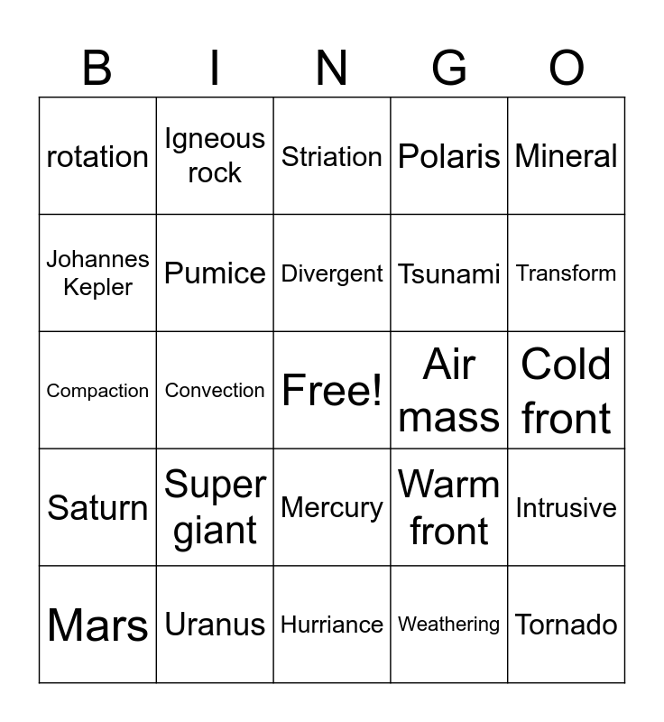 This bingo card has a free space and 54 words: Pangea, Saturn, Venus, Earth, Mercury, Sun, Polaris, Alfred Wegener, Johannes Kepler, Seasons, rotation, revolution, Uranus, Mars, Neptune, Hurriance, Tornado, Tsunami, Thunderstorm, Cold front, Warm front, Stationary front, Air mass, Mineral, Sedimentary rock, Igneous rock, metamorphic rock, Lava, Magma, Weathering, Erosion, Delta, Deposition, Glacier, Striation, Drumlin, Compaction, Intrusive, Extrusive, Pumice, Conglomerate, Wind belt, Latitude, Longitude, Super giant, Dwarf Star, Super nova, Convergent, Divergent, Convection, Transform, Trench, Ridge and Shadow Zone.