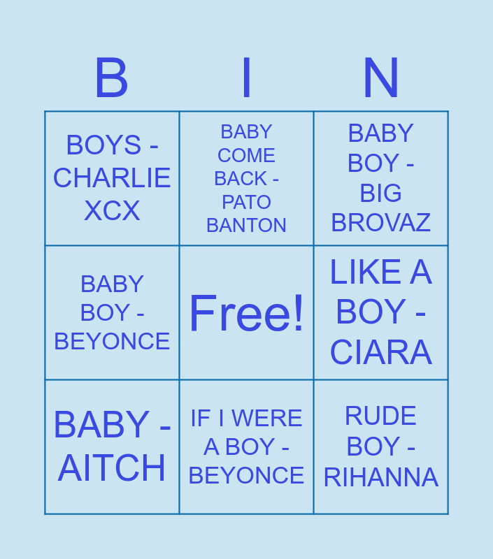 This bingo card has a free space and 36 words: BABY-BABY-BABY - TLC, ALWAYS BE MY BABY- MIRIAH CAREY, BABY - JUSTIN BIEBER, BABY - AITCH, BABY - ASHANTI, AMERICAN BOY - ESTELLE & KAYNE WEST, IF I WERE A BOY - BEYONCE, THE BOY IS MINE - MONICA, RUDE BOY - RIHANNA, SK8TER BOI - AVRIL LEVINE, BOY'S A LIAR - PINKPANTHERESS, BABY BOY - BEYONCE, BABY BY ME - 50 CENT, BABY SHARK - PINKFONG, LETS HEAR IT FOR THE BOY - DENIECE WILLIAMS, BOYS - CHARLIE XCX, CITY BOYS - BURNA BOY, BAD BOY FOR LIFE - BLACK ROB & P DIDDY, OH BOY - CAMRON, BABY BOY - BIG BROVAZ, BAD BOYS - ALEXANDRA BURKE, ICE ICE BABY - VANILLA ICE, BABY ONE MORE TIME - BRITNEY SPEARS, BABY LOVE - THE SUPREMES, BABY CAN I HOLD YOU - TRACY CHAPMAN, BABY COME BACK - PATO BANTON, THE BOY DOES NOTHING - ALEXANDRA BURKE, THE BOYS ARE BACK IN TOWN - THIN LIZZY, BAD BOYS - WHAM, LIKE A BOY - CIARA, THERE GOES MY BABY - USHER, RUNAWAY BABY - BRUNO MARS, BE MY BABY - THE RONETTES, BABY I LOV YOUR WAY – BIG MOUNTAIN, BABY ITS YOU – JOJO and I LUV YOU BABY – THE ORIGINAL.
