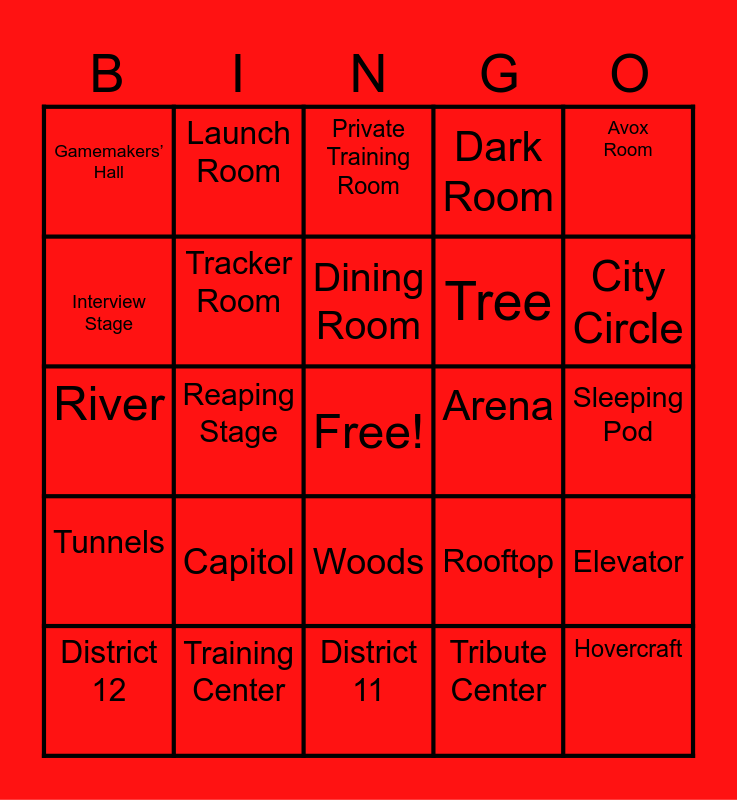 This bingo card has a free space and 24 words: Capitol, Training Center, Dining Room, District 12, Avox Room, Gamemakers’ Hall, Interview Stage, Launch Room, Arena, Woods, Tree, River, Rooftop, Elevator, Tracker Room, Tribute Center, Sleeping Pod, Private Training Room, City Circle, Reaping Stage, Hovercraft, Tunnels, Dark Room and District 11.