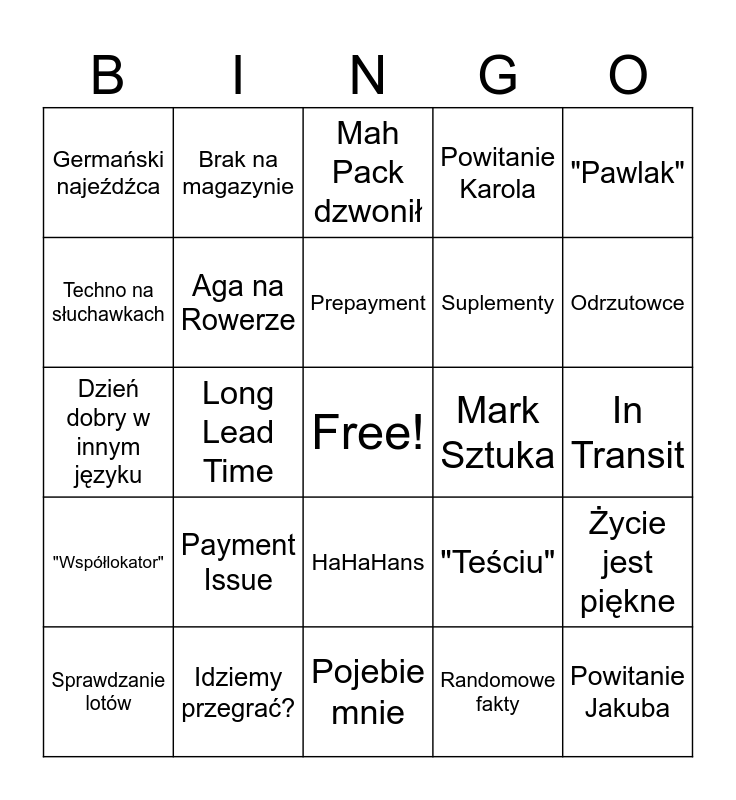 This bingo card has a free space and 37 words: Aga z HR, Odwiedziny Mikiego M/G, Aga w Punto, Aga na Rowerze, Życie jest piękne, Payment Issue, Prepayment, Lista płatności, "Pawlak", "Walenty", Long Lead Time, Powitanie Karola, Powitanie Jakuba, In Transit, Techno na słuchawkach, "Współlokator", CS issue, Mah Pack dzwonił, HaHaHans, Mark Sztuka, Germański najeźdźca, Odrzutowce, Sprawdzanie lotów, Pojebie mnie, Przeklinająca Swieta, Randomowe fakty, Brak na magazynie, Dziwne akcje na operacyjnym, Dziwne akcje na open space, Kocopoły, Bambiki, Idziemy przegrać?, Dzień dobry w innym języku, Anulowane/Przełożone spotkanie, "Teściu", Suplementy and Włączona lampka lub klima.