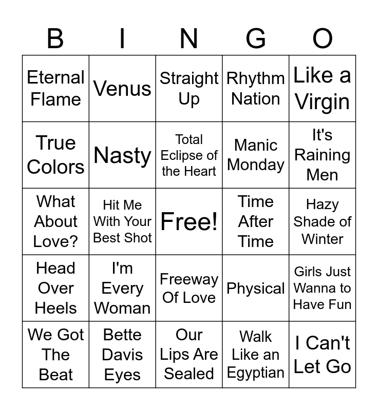This bingo card has a free space and 38 words: How Will I Know, I'm Coming Out, Bad Girls, Nasty, Girls Just Wanna to Have Fun, I'm Every Woman, Total Eclipse of the Heart, Best of My Love, Like a Virgin, Manic Monday, Hit Me With Your Best Shot, Rhythm Nation, I Can't Let Go, Hazy Shade of Winter, True Colors, Head Over Heels, I Think We're Alone Now, Straight Up, Seasons Change, Time After Time, Eternal Flame, Bette Davis Eyes, It's Raining Men, We Got The Beat, Kids In America, Our Lips Are Sealed, Into the Groove, Hold On, If I Could Turn Back Time, Material Girl, What's Love Got to Do with It, Freeway Of Love, Walk Like an Egyptian, Venus, Wind Beneath My Wings, Physical, What About Love? and Heaven Is A Place On Earth.