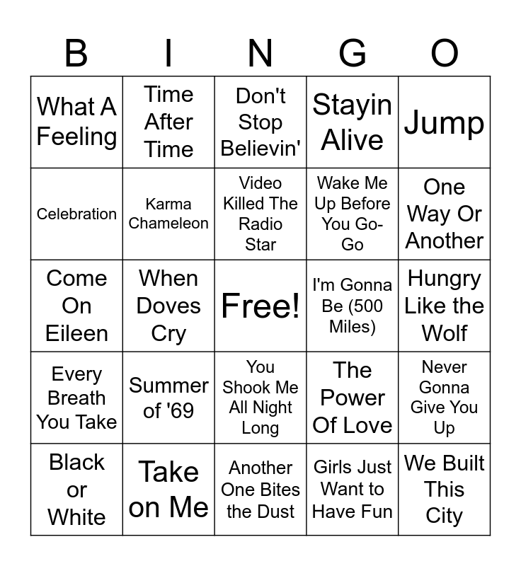 This bingo card has a free space and 59 words: Dancing Queen, Take on Me, Africa, Every Breath You Take, Girls Just Want to Have Fun, Billie Jean, Karma Chameleon, Sweet Dreams, Wake Me Up Before You Go-Go, Livin' On A Prayer, Stayin Alive, Beat It, Celebration, Walking On Sunshine, King Fu Fighting, What A Feeling, We Built This City, Jump, Tainted Love, Video Killed The Radio Star, I'm Gonna Be (500 Miles), Don't Stop Believin', Black or White, Never Gonna Give You Up, Material Girl, Uptown Girl, Don't You (Forget About Me), Total Eclipse of the Heart, One Way Or Another, Hooked On A Feeling, Kids In America, Dancing In the Dark, Crocodile Rock, Believe, Time After Time, I Remember You, Like a Virgin, When Doves Cry, The Final Countdown my Sharona, Come On Eileen, Rebel Yell, Summer of '69, Hungry Like the Wolf, I Wanna Dance With Somebody, Your Love, Danger Zone, Maneater, Sweet Child O' Mine, You Shook Me All Night Long, Another One Bites the Dust, Eye of the Tiger, Should I Stay or Should I Go, You Spin Me Round (Like a Record), I Love Rock 'N Roll, Welcome To The Jungle, The Power Of Love, We Didn't Start the Fire, Holding Out for a Hero and Faith.