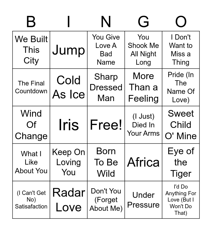 This bingo card has a free space and 30 words: Radar Love, Thunderstruck, Iris, Paint It Black, We Built This City, You Give Love A Bad Name, Cold As Ice, Born To Be Wild, (I Just) Died In Your Arms, Don't You (Forget About Me), Sweet Child O' Mine, I'd Do Anything For Love (But I Won't Do That), Under Pressure, Hold the Line, Pride (In The Name Of Love), Livin' On A Prayer, Africa, What I Like About You, Keep On Loving You, I Don't Want to Miss a Thing, Wind Of Change, I Was Made For Lovink You, Jump, More Than a Feeling, The Final Countdown, You Shook Me All Night Long, Eye of the Tiger, (I Can't Get No) Satisafaction, Sharp Dressed Man and Every Breath You Take.