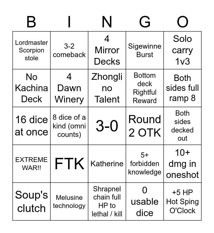 This bingo card has a free space and 24 words: FTK, Melusine technology, Zhongli no Talent, Soup's clutch, Solo carry 1v3, Lordmaster Scorpion stole, No Kachina Deck, 3-2 comeback, Round 2 OTK, Katherine, Bottom deck Rightful Reward, 16 dice at once, 5+ forbidden knowledge, 10+ dmg in oneshot, 4 Dawn Winery, 0 usable dice, Both sides decked out, 4 Mirror Decks, Both sides full ramp 8, 8 dice of a kind (omni counts), +5 HP Hot Sping O'Clock, EXTREME WAR!!, Sigewinne Burst and Shrapnel chain full HP to lethal / kill.