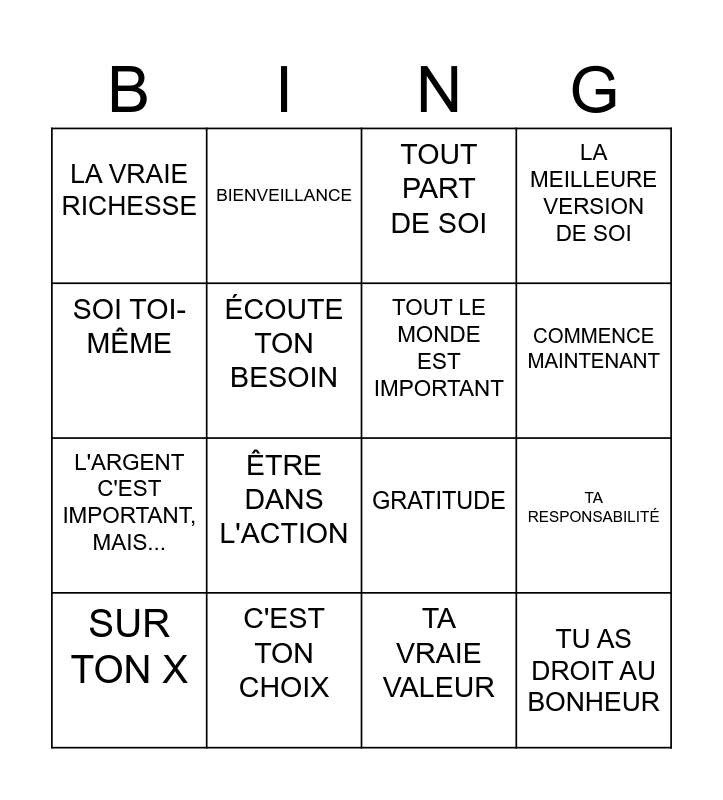 This bingo card has 16 words: C'EST TON CHOIX, TA RESPONSABILITÉ, TOUT PART DE SOI, LA VRAIE RICHESSE, L'ARGENT C'EST IMPORTANT, MAIS..., BIENVEILLANCE, GRATITUDE, TA VRAIE VALEUR, SOI TOI-MÊME, ÉCOUTE TON BESOIN, SUR TON X, LA MEILLEURE VERSION DE SOI, ÊTRE DANS L'ACTION, COMMENCE MAINTENANT, TOUT LE MONDE EST IMPORTANT and TU AS DROIT AU BONHEUR.