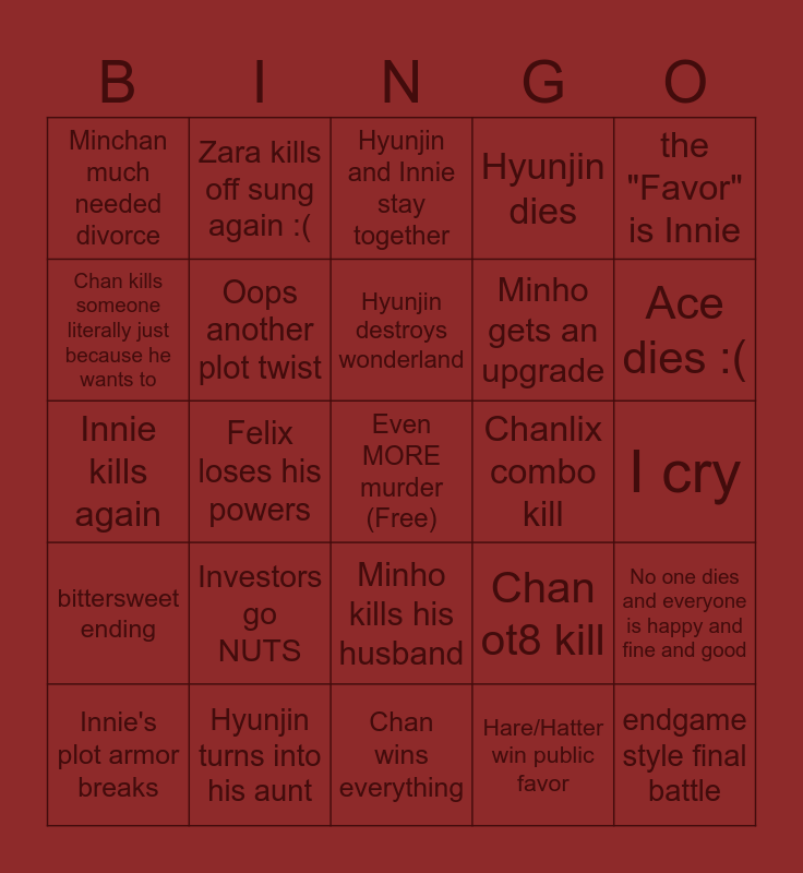 This bingo card has a free space and 24 words: Investors go NUTS, Hyunjin turns into his aunt, Hyunjin destroys wonderland, Innie's plot armor breaks, the "Favor" is Innie, Minchan much needed divorce, Chan kills someone literally just because he wants to, Zara kills off sung again :(, Chanlix combo kill, Minho kills his husband, Minho gets an upgrade, Innie kills again, Chan ot8 kill, No one dies and everyone is happy and fine and good, Oops another plot twist, Hare/Hatter win public favor, I cry, Hyunjin and Innie stay together, Ace dies :(, Felix loses his powers, endgame style final battle, bittersweet ending, Hyunjin dies and Chan wins everything.