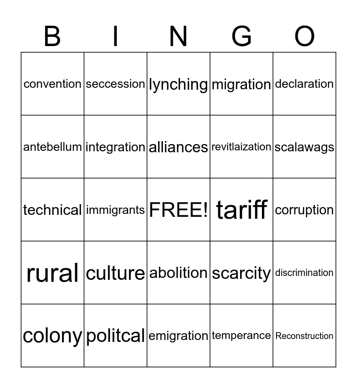 This bingo card has a free space and 24 words: culture, politcal, alliances, colony, declaration, convention, antebellum, seccession, tariff, abolition, revitlaization, technical, scarcity, discrimination, integration, temperance, corruption, lynching, scalawags, immigrants, Reconstruction, rural, migration and emigration.