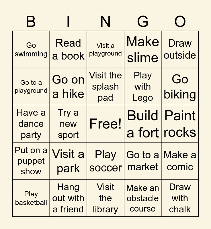 This bingo card has a free space and 24 words: Visit a park, Hang out with a friend, Visit the splash pad, Play basketball, Draw outside, Go swimming, Go to a playground, Read a book, Build a fort, Play soccer, Play with Lego, Have a dance party, Go to a market, Make a comic, Go on a hike, Make an obstacle course, Paint rocks, Visit a playground, Go biking, Try a new sport, Draw with chalk, Put on a puppet show, Make slime and Visit the library.