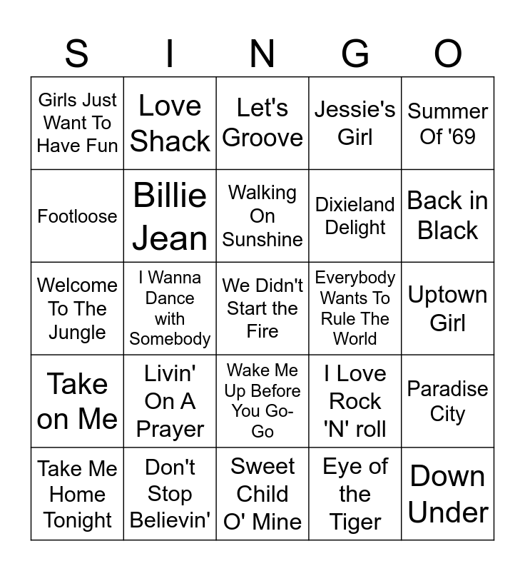 This bingo card has 30 words: Don't Stop Believin', Africa, I Wanna Dance with Somebody, Under Pressure, Girls Just Want To Have Fun, Let's Groove, Billie Jean, Wake Me Up Before You Go-Go, Everybody Wants To Rule The World, Sweet Child O' Mine, Uptown Girl, We Didn't Start the Fire, Eye of the Tiger, Down Under, Back in Black, Beat It, I Love Rock 'N' roll, Take on Me, Livin' On A Prayer, Summer Of '69, Welcome To The Jungle, You Give Love A Bad Name, Love Shack, Dixieland Delight, Footloose, Jessie's Girl, Paradise City, Take Me Home Tonight, Walking On Sunshine and Maneater.