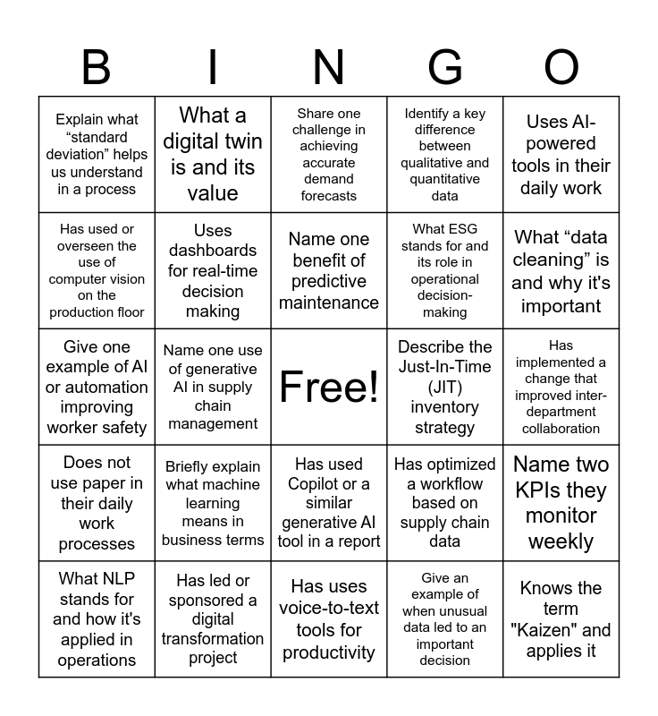 This bingo card has a free space and 24 words: Briefly explain what machine learning means in business terms, Has led or sponsored a digital transformation project, Name one benefit of predictive maintenance, What NLP stands for and how it's applied in operations, Uses AI-powered tools in their daily work, Explain what “standard deviation” helps us understand in a process, Has used or overseen the use of computer vision on the production floor, What a digital twin is and its value, Describe the Just-In-Time (JIT) inventory strategy, Has used Copilot or a similar generative AI tool in a report, What ESG stands for and its role in operational decision-making, Give one example of AI or automation improving worker safety, Has optimized a workflow based on supply chain data, Name two KPIs they monitor weekly, Uses dashboards for real-time decision making, Give an example of when unusual data led to an important decision, Has implemented a change that improved inter-department collaboration, Share one challenge in achieving accurate demand forecasts, What “data cleaning” is and why it's important, Name one use of generative AI in supply chain management, Knows the term "Kaizen" and applies it, Does not use paper in their daily work processes, Identify a key difference between qualitative and quantitative data and Has uses voice-to-text tools for productivity.