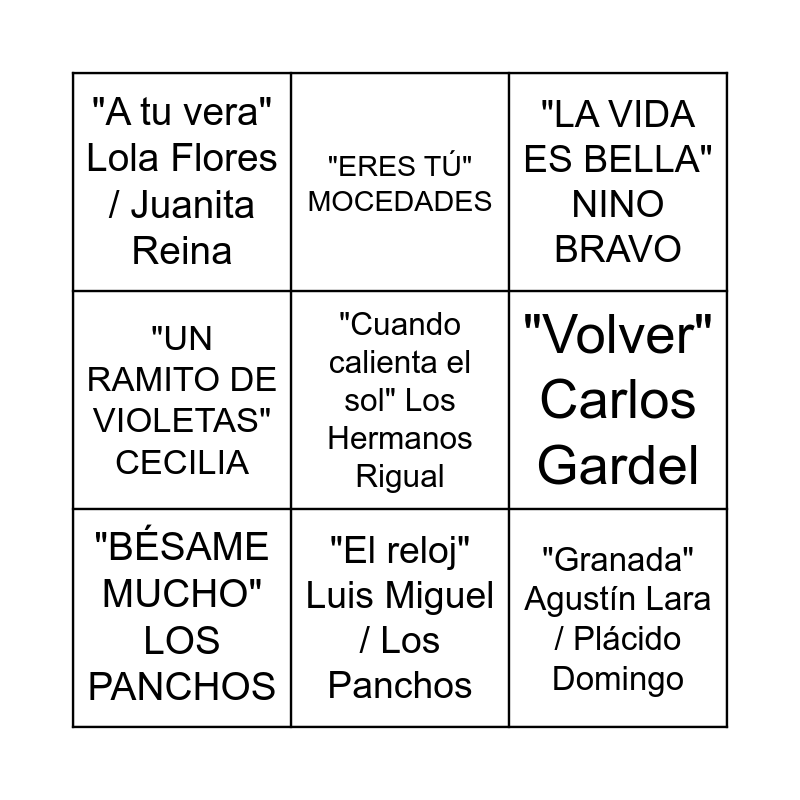 This bingo card has 9 words: "BÉSAME MUCHO" LOS PANCHOS, "LA VIDA ES BELLA" NINO BRAVO, "ERES TÚ" MOCEDADES, "UN RAMITO DE VIOLETAS" CECILIA, "A tu vera" Lola Flores / Juanita Reina, "Volver" Carlos Gardel, "Cuando calienta el sol" Los Hermanos Rigual, "Granada" Agustín Lara / Plácido Domingo and "El reloj" Luis Miguel / Los Panchos.
