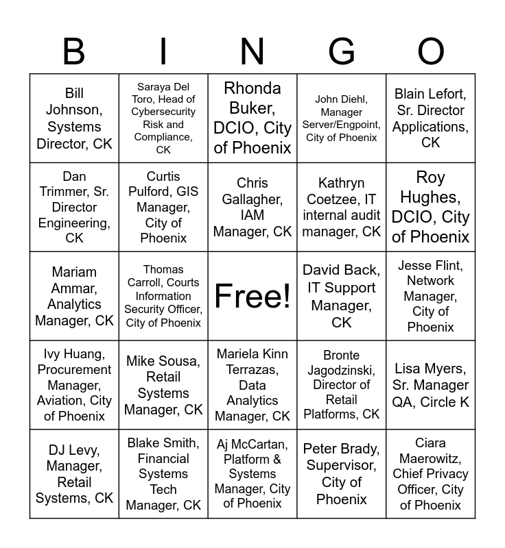 This bingo card has a free space and 24 words: Mike Sousa, Retail Systems Manager, CK, Blake Smith, Financial Systems Tech Manager, CK, Chris Gallagher, IAM Manager, CK, DJ Levy, Manager, Retail Systems, CK, Blain Lefort, Sr. Director Applications, CK, Bill Johnson, Systems Director, CK, Dan Trimmer, Sr. Director Engineering, CK, Saraya Del Toro, Head of Cybersecurity Risk and Compliance, CK, David Back, IT Support Manager, CK, Mariela Kinn Terrazas, Data Analytics Manager, CK, Kathryn Coetzee, IT internal audit manager, CK, Mariam Ammar, Analytics Manager, CK, Bronte Jagodzinski, Director of Retail Platforms, CK, Lisa Myers, Sr. Manager QA, Circle K, Curtis Pulford, GIS Manager, City of Phoenix, Peter Brady, Supervisor, City of Phoenix, Jesse Flint, Network Manager, City of Phoenix, Rhonda Buker, DCIO, City of Phoenix, Roy Hughes, DCIO, City of Phoenix, Thomas Carroll, Courts Information Security Officer, City of Phoenix, Ciara Maerowitz, Chief Privacy Officer, City of Phoenix, Ivy Huang, Procurement Manager, Aviation, City of Phoenix, John Diehl, Manager Server/Engpoint, City of Phoenix and Aj McCartan, Platform & Systems Manager, City of Phoenix.