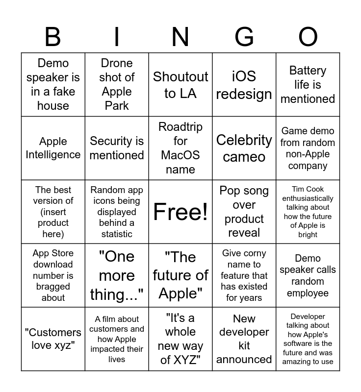 This bingo card has a free space and 24 words: "One more thing...", A film about customers and how Apple impacted their lives, Roadtrip for MacOS name, "Customers love xyz", Battery life is mentioned, Demo speaker is in a fake house, Apple Intelligence, Drone shot of Apple Park, Pop song over product reveal, "The future of Apple", Celebrity cameo, The best version of (insert product here), Give corny name to feature that has existed for years, Demo speaker calls random employee, Security is mentioned, New developer kit announced, Tim Cook enthusiastically talking about how the future of Apple is bright, Shoutout to LA, Game demo from random non-Apple company, Random app icons being displayed behind a statistic, Developer talking about how Apple's software is the future and was amazing to use, App Store download number is bragged about, iOS redesign and "It's a whole new way of XYZ".