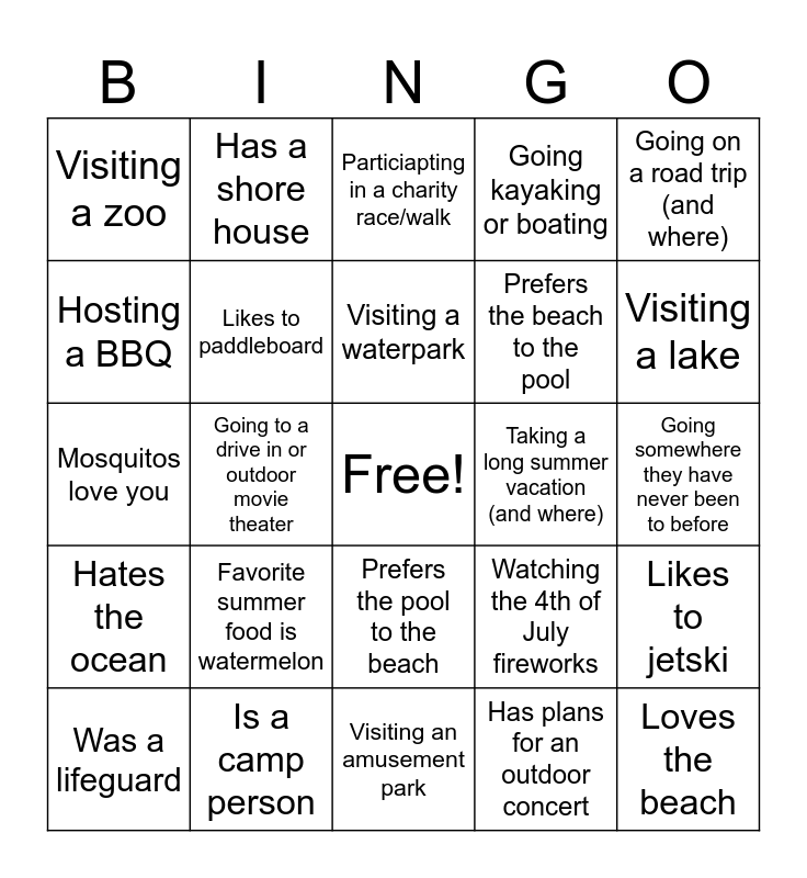 This bingo card has a free space and 24 words: Favorite summer food is watermelon, Is a camp person, Visiting a waterpark, Was a lifeguard, Going on a road trip (and where), Visiting a zoo, Hosting a BBQ, Has a shore house, Taking a long summer vacation (and where), Prefers the pool to the beach, Prefers the beach to the pool, Mosquitos love you, Watching the 4th of July fireworks, Likes to jetski, Likes to paddleboard, Has plans for an outdoor concert, Going somewhere they have never been to before, Particiapting in a charity race/walk, Visiting a lake, Going to a drive in or outdoor movie theater, Loves the beach, Hates the ocean, Going kayaking or boating and Visiting an amusement park.