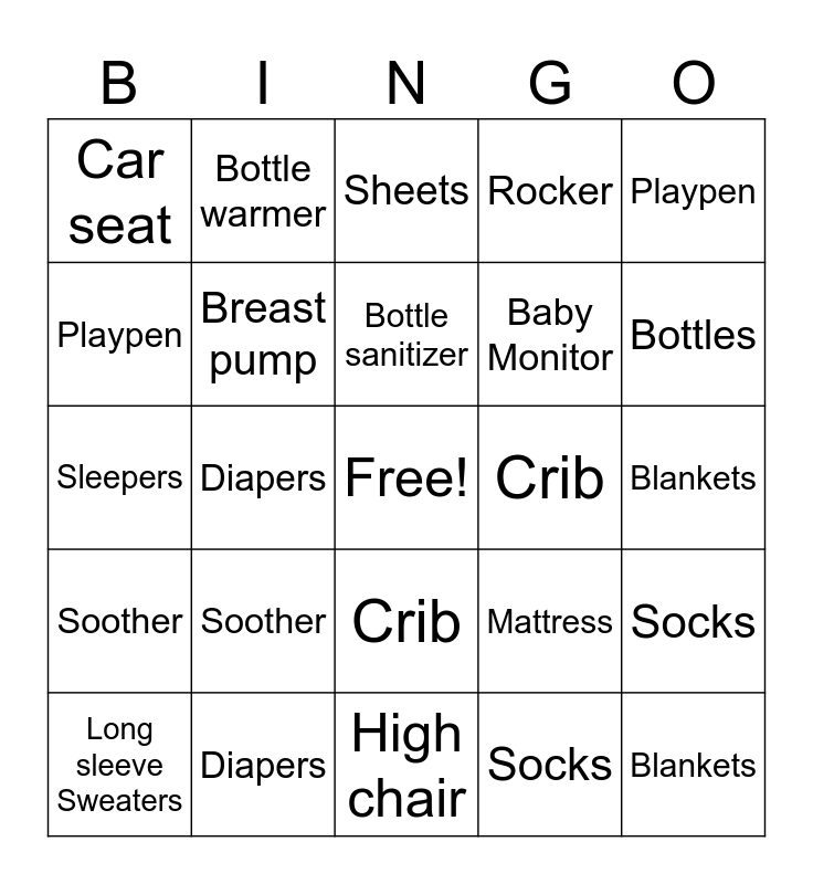 This bingo card has a free space and 46 words: Car seat, Diapers, Diaper bag, Baby Monitor, Blankets, Long sleeve Sweaters, Bottle warmer, Bottle sanitizer, Rocker, Sweatsuit, Sleepers, Breast pump, Mattress, Socks, Bottles, Wipes, Sheets, Crib, Stroller, Playpen, Soother, High chair, Car seat, Diapers, Diaper bag, Baby Monitor, Blankets, Long sleeve Sweaters, Bottle warmer, Bottle sanitizer, Rocker, Sweatsuit, Sleepers, Breast pump, Mattress, Socks, Bottles, Wipes, Sheets, Crib, Stroller, Playpen, Soother, High chair, Baby rattle and Baby crocs.