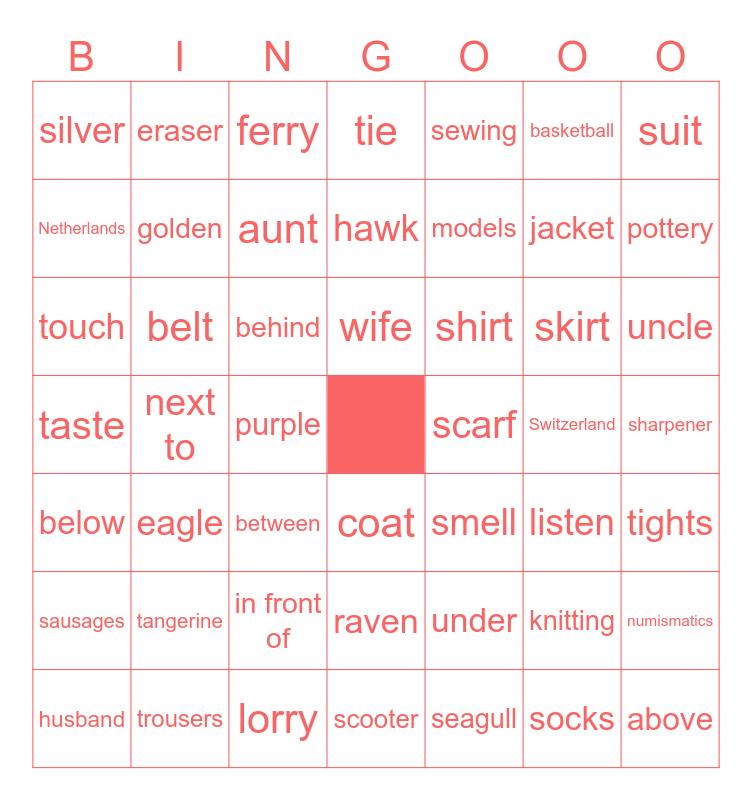 This bingo card has a free space and 48 words: under, jacket, scooter, next to, behind, sharpener, eraser, trousers, basketball, coat, suit, tie, skirt, shirt, sausages, Switzerland, Netherlands, pottery, knitting, sewing, models, purple, silver, golden, numismatics, aunt, uncle, husband, wife, belt, socks, scarf, tights, tangerine, taste, smell, listen, touch, between, in front of, below, above, ferry, lorry, hawk, raven, eagle and seagull.