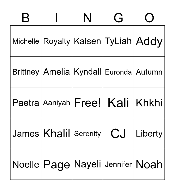 This bingo card has a free space and 24 words: Khalil, Page, Kyndall, Noelle, Addy, Michelle, Brittney, Royalty, Kali, Serenity, Euronda, Paetra, CJ, Liberty, Amelia, Jennifer, Khkhi, Kaisen, Autumn, Aaniyah, Noah, James, TyLiah and Nayeli.