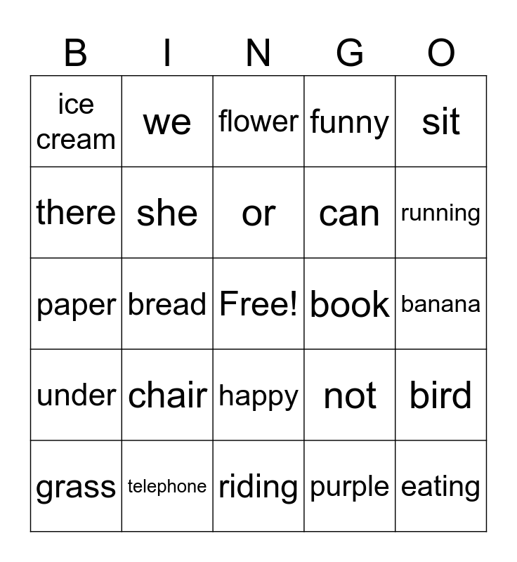 This bingo card has a free space and 24 words: chair, telephone, or, grass, sit, ice cream, there, we, book, happy, can, paper, not, bird, she, purple, banana, flower, running, bread, eating, under, funny and riding.