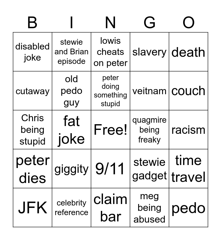 This bingo card has a free space and 24 words: JFK, giggity, peter doing something stupid, meg being abused, death, disabled joke, stewie and Brian episode, lowis cheats on peter, quagmire being freaky, racism, Chris being stupid, old pedo guy, stewie gadget, time travel, cutaway, celebrity reference, claim bar, slavery, couch, peter dies, fat joke, 9/11, veitnam and pedo.