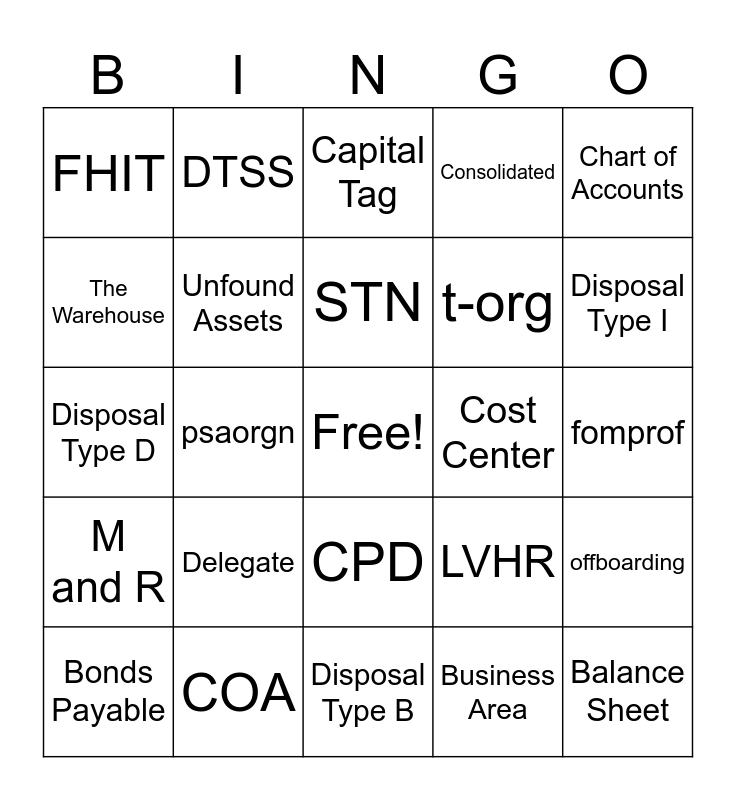 This bingo card has a free space and 45 words: Audit, Balance Sheet, Banner, Bonds Payable, BSR, Business Area, Capital Tag, Cash Flow Statement, Chart of Accounts, COA, Consolidated, Cost Center, CPD, Delegate, Disposal Type A, Disposal Type B, Disposal Type C, Disposal Type D, Disposal Type E, Disposal Type I, DTSS, Effort Certification, FASB, FHIT, FOAP, fomprof, IAN, Inventory Log Summary, LVHR, M and R, ntrrque, offboarding, OOE, OptiPlex AIO, Proxy, psaorgn, ptruser, S/N, Security classes, STN, The Warehouse, t-org, Transfer Detail, Unfound Assets and VPAT.