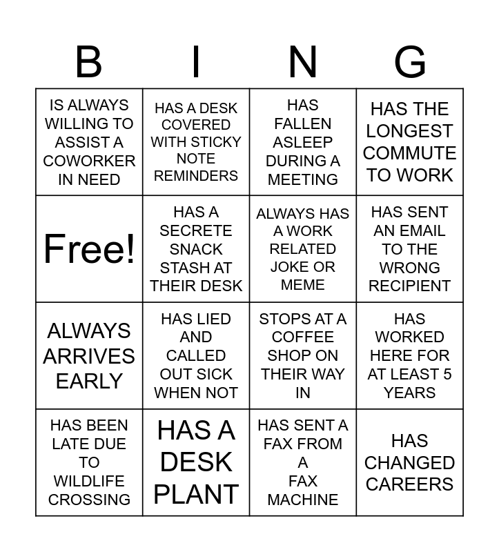 This bingo card has 17 words: HAS BEEN LATE DUE TO WILDLIFE CROSSING, HAS A DESK PLANT, HAS FALLEN ASLEEP DURING A MEETING, HAS THE LONGEST COMMUTE TO WORK, ALWAYS ARRIVES EARLY, HAS A SECRETE SNACK STASH AT THEIR DESK, STOPS AT A COFFEE SHOP ON THEIR WAY IN, HAS SENT AN EMAIL TO THE WRONG RECIPIENT, Free!, HAS LIED AND CALLED OUT SICK WHEN NOT, HAS SENT A FAX FROM A FAX MACHINE, HAS WORKED HERE FOR AT LEAST 5 YEARS, IS ALWAYS WILLING TO ASSIST A COWORKER IN NEED, HAS A DESK COVERED WITH STICKY NOTE REMINDERS, ALWAYS HAS A WORK RELATED JOKE OR MEME, HAS CHANGED CAREERS and HAS PRESENTED DURING A WORK CONFERENCE.