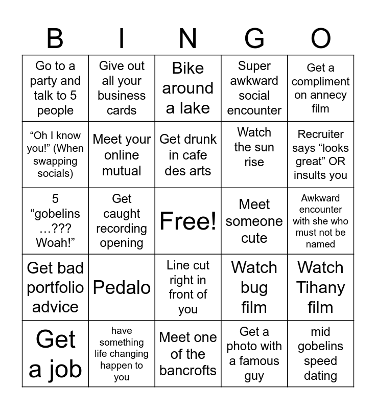 This bingo card has a free space and 24 words: Get a job, Pedalo, Get drunk in cafe des arts, Get a photo with a famous guy, Get a compliment on annecy film, Go to a party and talk to 5 people, Give out all your business cards, Bike around a lake, Meet someone cute, Awkward encounter with she who must not be named, 5 “gobelins …??? Woah!”, Meet your online mutual, Watch bug film, Watch Tihany film, “Oh I know you!” (When swapping socials), have something life changing happen to you, Meet one of the bancrofts, Super awkward social encounter, Recruiter says “looks great” OR insults you, Get bad portfolio advice, Get caught recording opening, Line cut right in front of you, Watch the sun rise and mid gobelins speed dating.