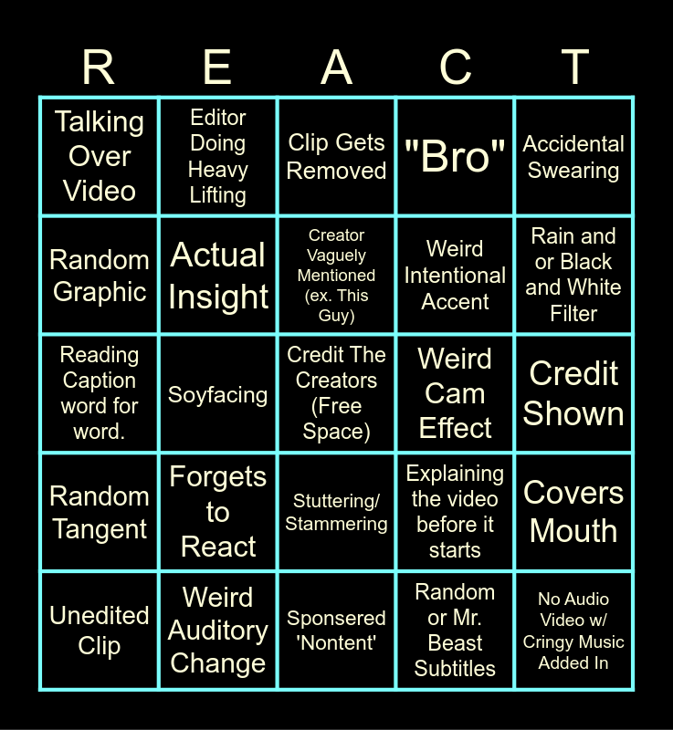 This bingo card has a free space and 37 words: Unnecessary Yelling, "Thats Crazy", Nothing Burger, Actual Insight, Covers Mouth, Forgets to React, Creator Vaguely Mentioned (ex. This Guy), Bullies Person In Video, Accidental Swearing, Stock/Vine Sound Effect, Soyfacing, "Bro", No Audio Video w/ Cringy Music Added In, Credit Shown, Random Graphic, Random Tangent, Weird Flex, Clip Gets Removed, Stuttering/ Stammering, Weird Cam Effect, Talking Over Video, Rain and or Black and White Filter, Unedited Clip, Sponsered 'Nontent', Complicated Math Background Effect, Random or Mr. Beast Subtitles, Editor Doing Heavy Lifting, Lightbulb Sound Effect, Freeboot of a Freeboot, Fake Laugh, Bad Crop, Weird Auditory Change, Reading Caption word for word., Weird Zoom, Explaining the video before it starts, Weird Intentional Accent and Repeat of a called Bingo Space.