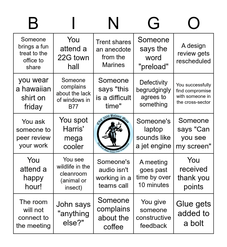 This bingo card has a free space and 39 words: You participated in the board game lunch, You went to the 22G lunch, Another designer is added to 22G, Someone complains about the lack of windows in B77, The room will not connect to the meeting, Someone's audio isn't working in a teams call, Someone says "this is a difficult time", The fire alarm goes off, A design review gets rescheduled, You attend a happy hour!, You spot Harris' mega cooler, Someone says the word "preload", Glue gets added to a bolt, Someone says "Can you see my screen", Someone's laptop sounds like a jet engine, You see wildlife in the cleanroom (animal or insect), Someone says "can you go back a slide", Someone brings a fun treat to the office to share, Someone says they couldn't get parking in 77, A meeting goes past time by over 10 minutes, you wear a hawaiian shirt on friday, Someone complains about the coffee, Defectivity begrudgingly agrees to something, You successfully find compromise with someone in the cross-sector, You help someone with a problem they're having, An action in the cleanroom is delayed, You peer review someone's work, You go to get water and the water dispenser is not working, Someone says "fair enough", You attend a 22G town hall, Someone says "perfect is the enemy of good enough", Someone's computer crashes mid-presentation, Trent shares an anecdote from the Marines, John says "anything else?", You give someone constructive feedback, You send someone thank you points, You received thank you points, You ask someone to peer review your work and Your share something in the group meeting.